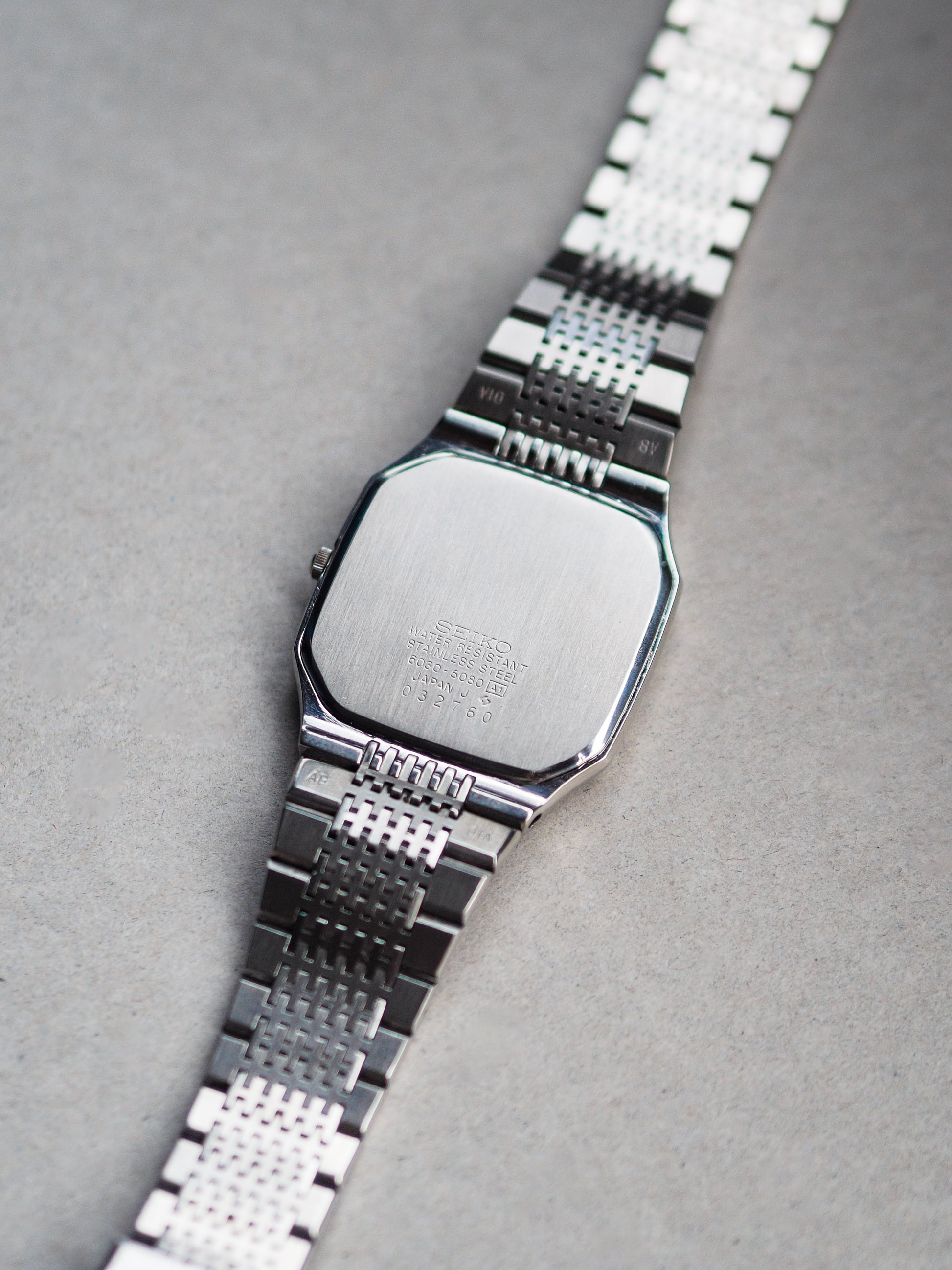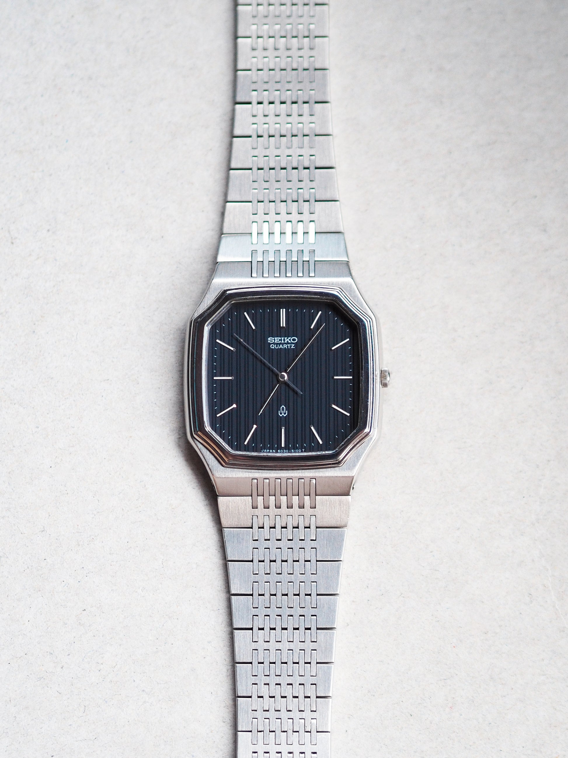 The Seiko 6030-5080, a vintage quartz timepiece from the 1980s, features a distinctive stainless steel octagonal case with gently curved sides, seamlessly integrated with its original bracelet. Its striking grey dial with black pinstripes adds a unique and sophisticated touch to the overall design.