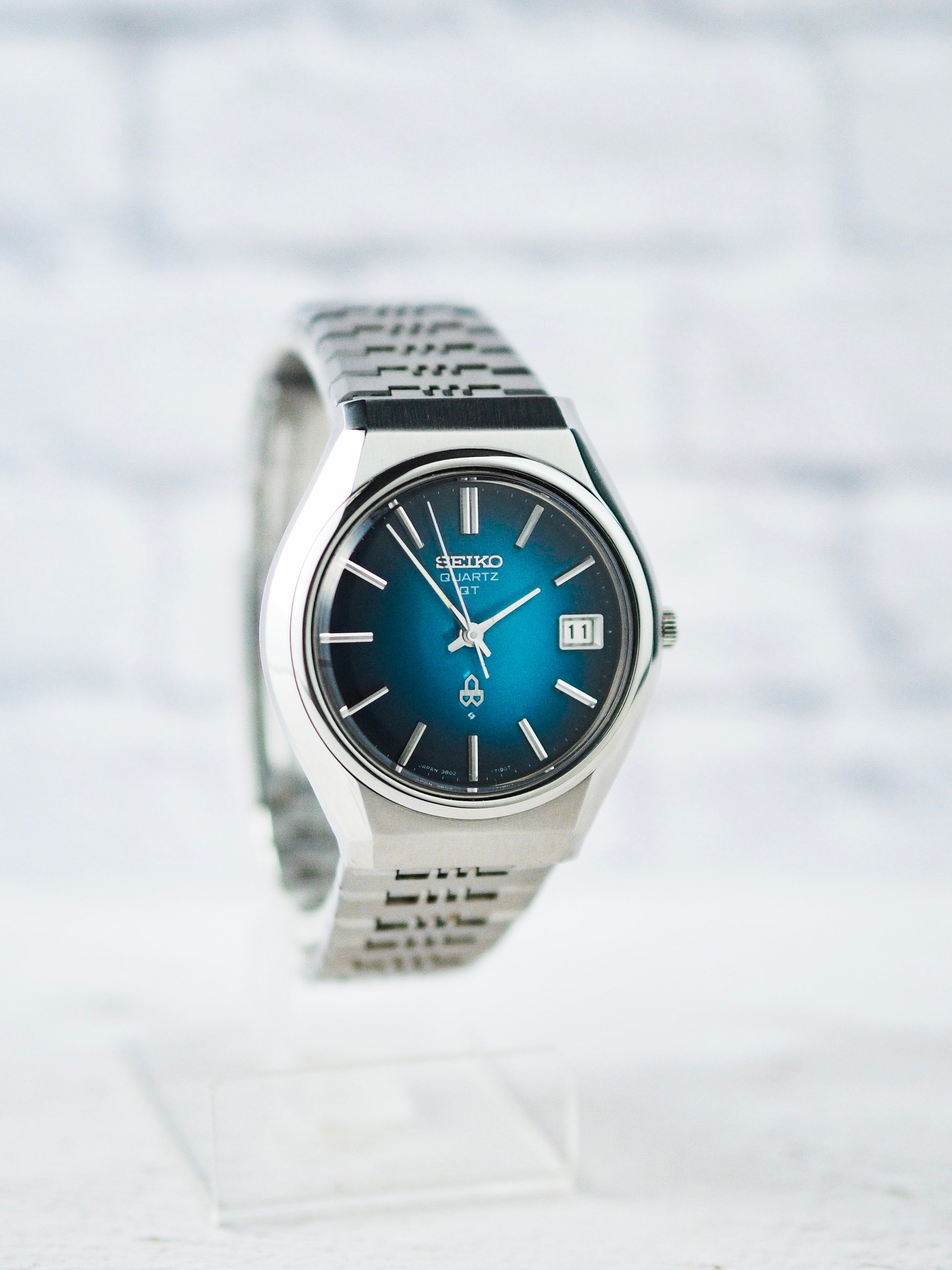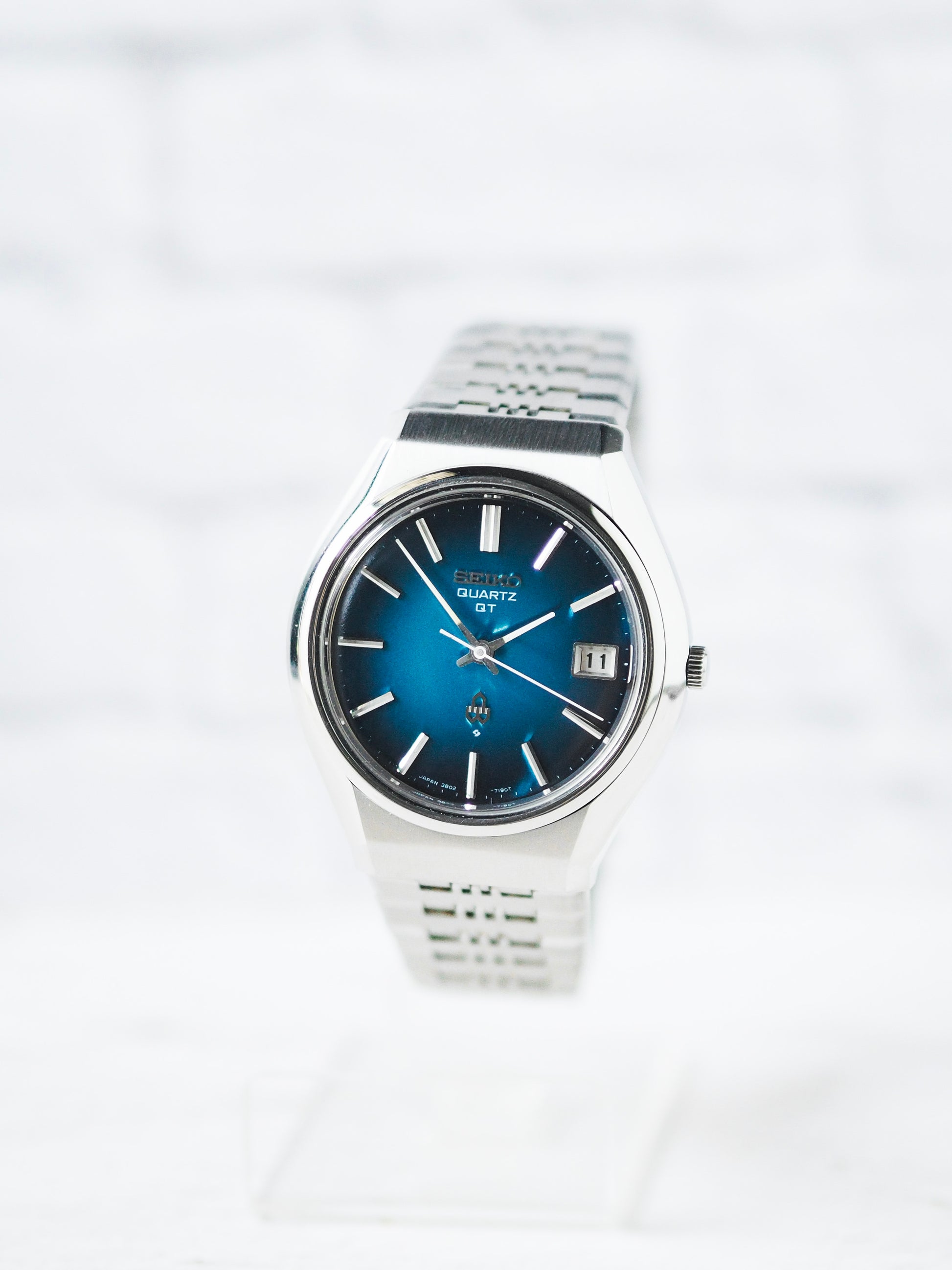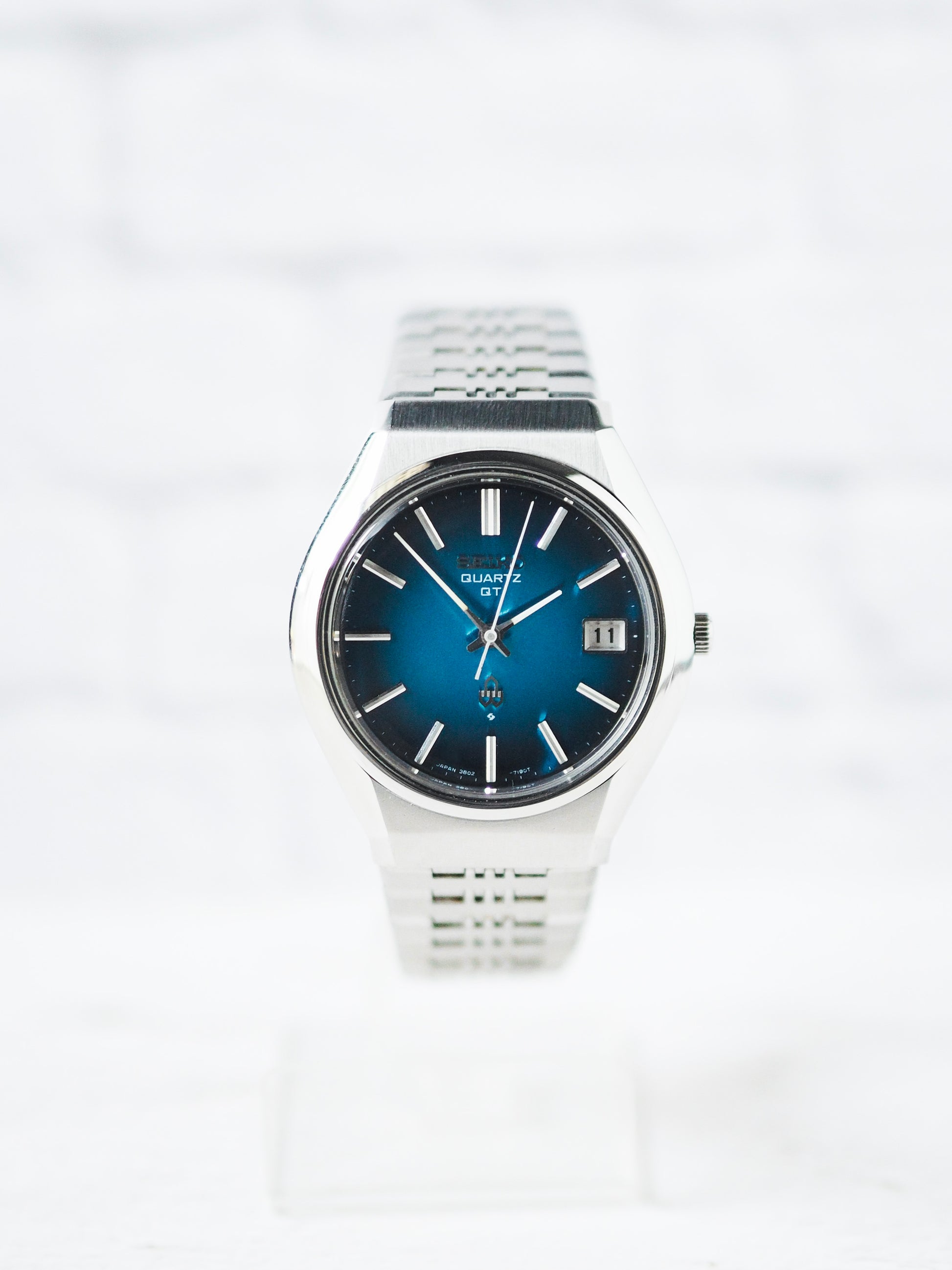 One notable line from this era is the Seiko Quartz QT series, known for its unique dial colors and exceptional build quality. Like the 1974 production model 3802-7110 here, is a standout example, featuring a stunning radial blue dial with a gradient effect, complemented by sleek stick indices and slim hands.