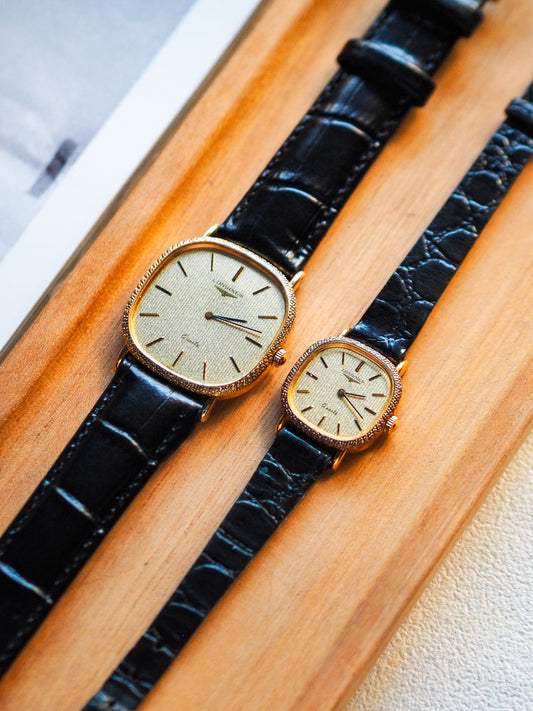 Couple Longines Quartz Square SGP Textured Bezel Champagne Tapestry Dial