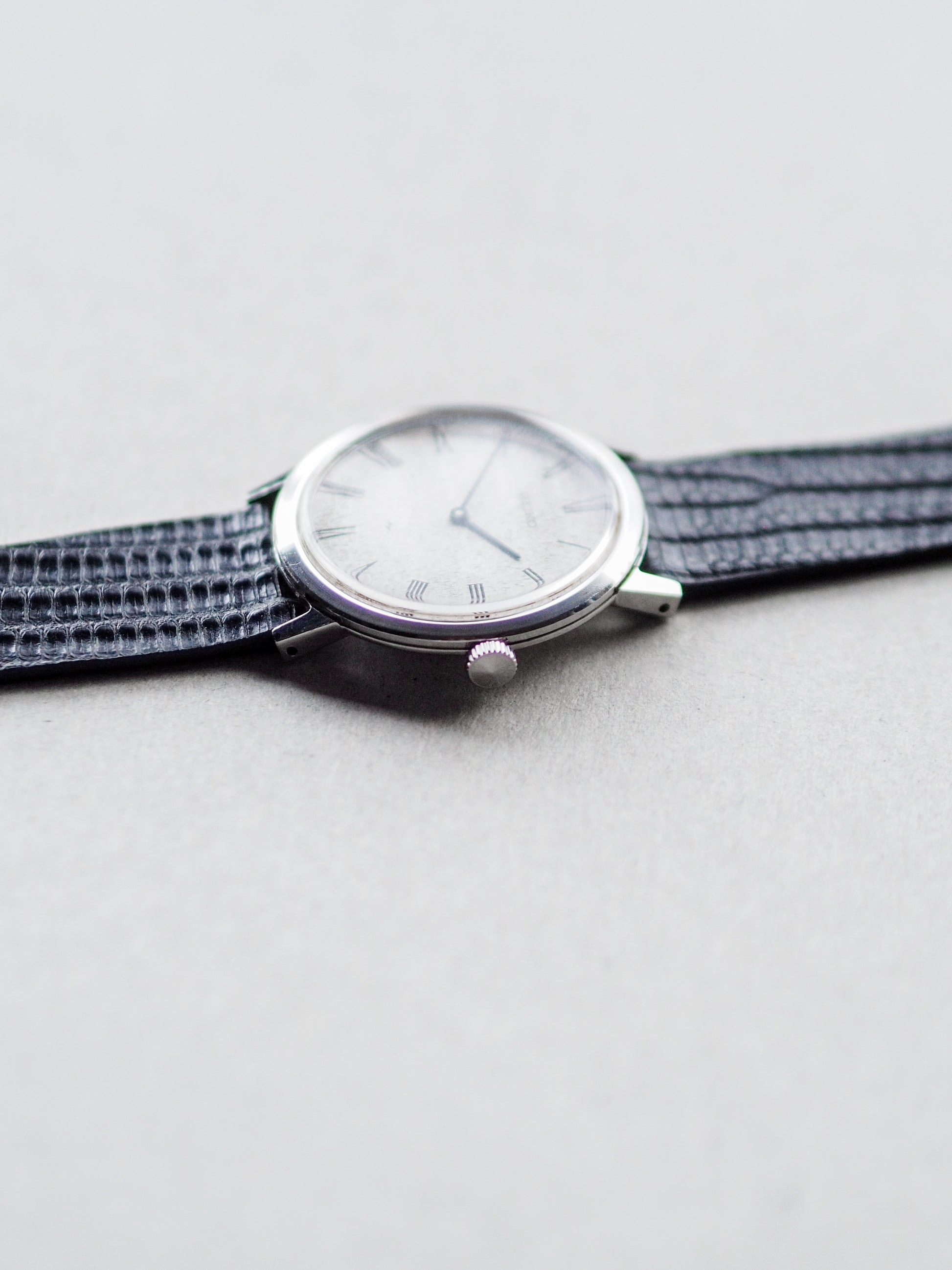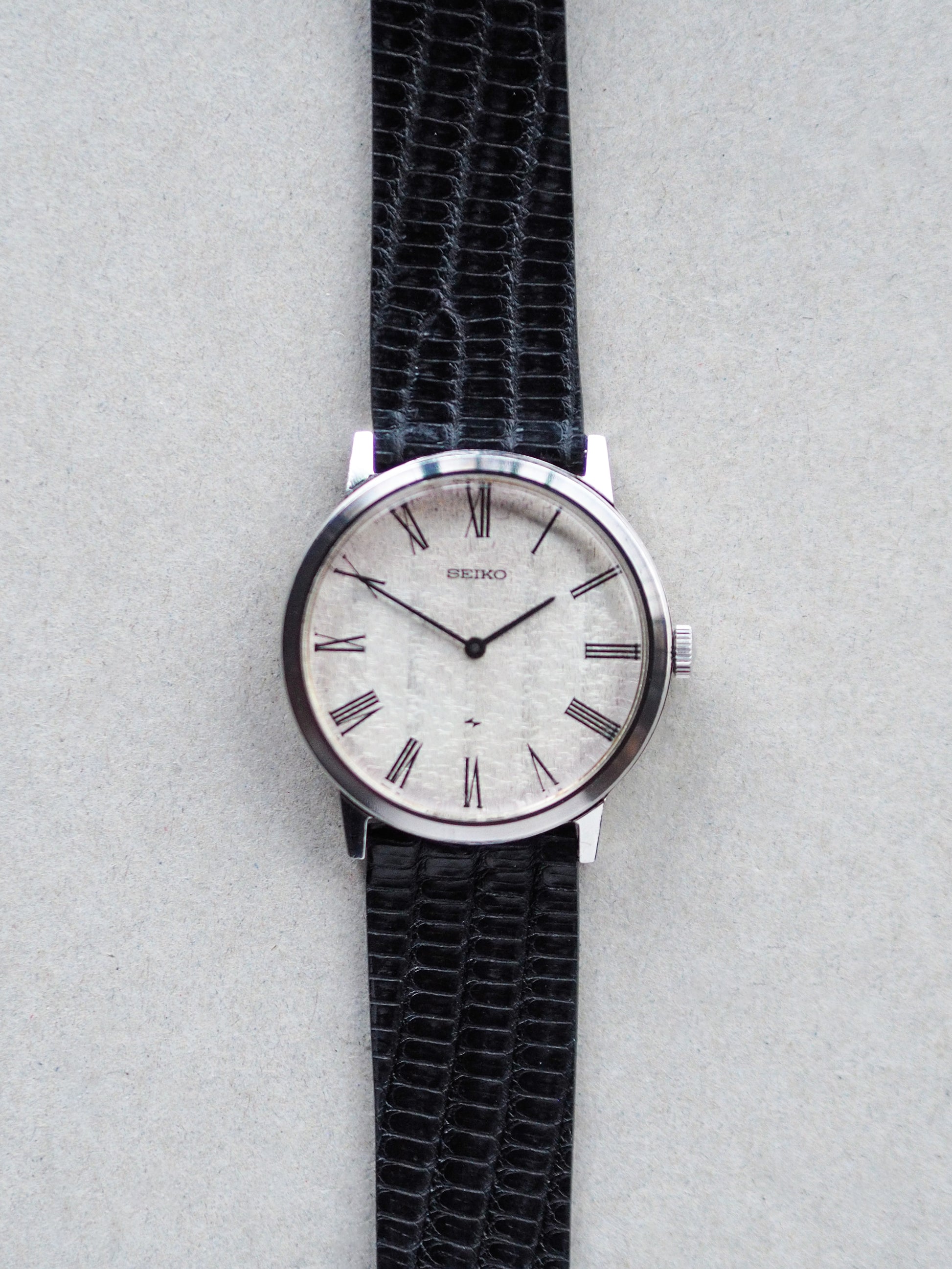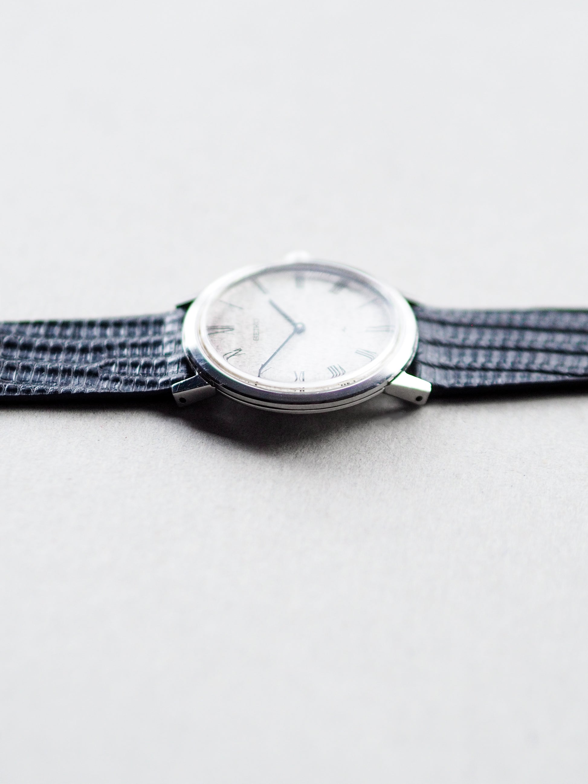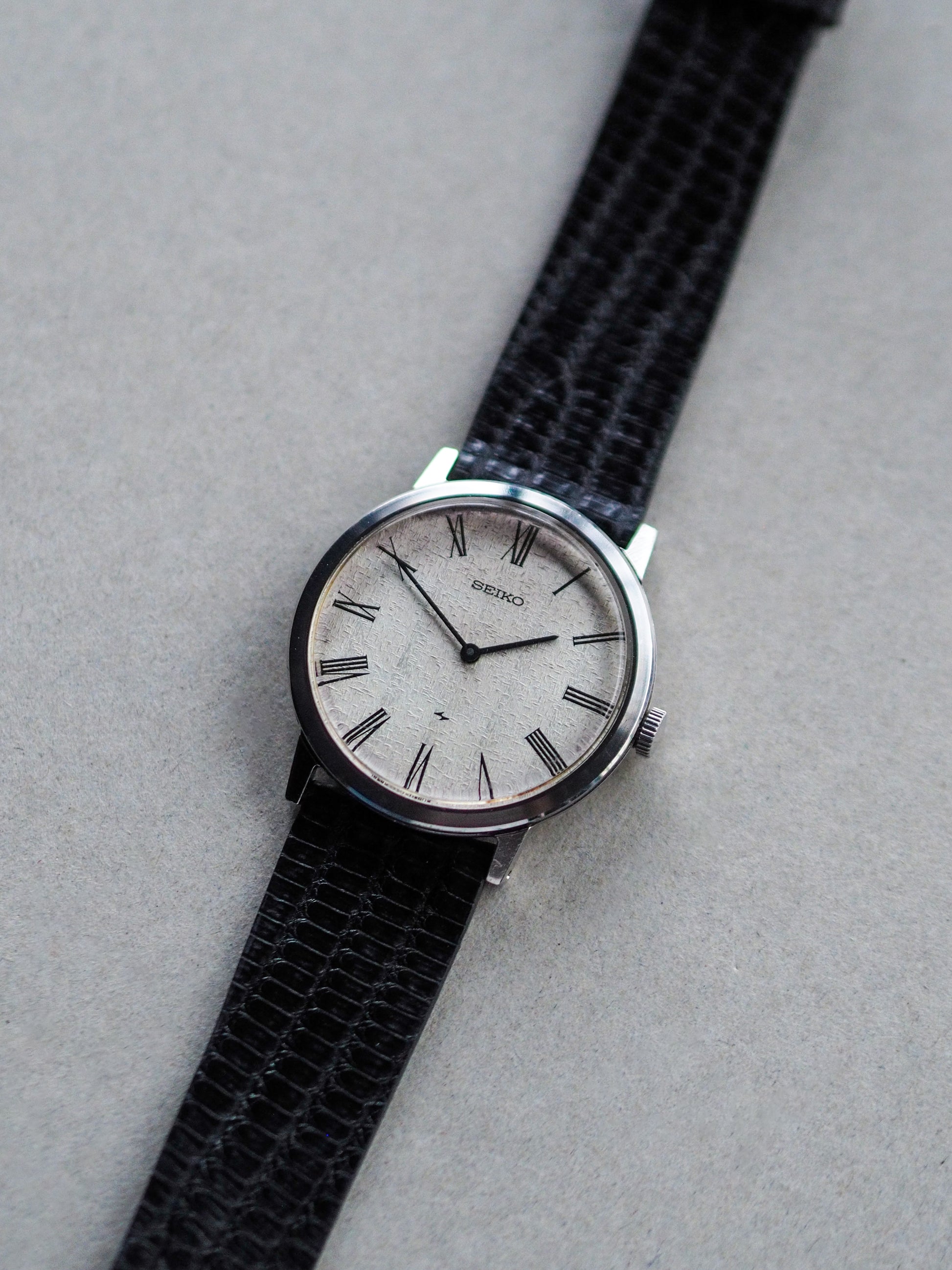 1974 年左右的 Seiko Chariot 编号 2220-0430 展示了令人惊叹的白色锤击表盘,带有华夫饼状图案和罗马时标。这款复古腕表外形纤薄,既舒适又美观,是一款真正华丽的腕表。