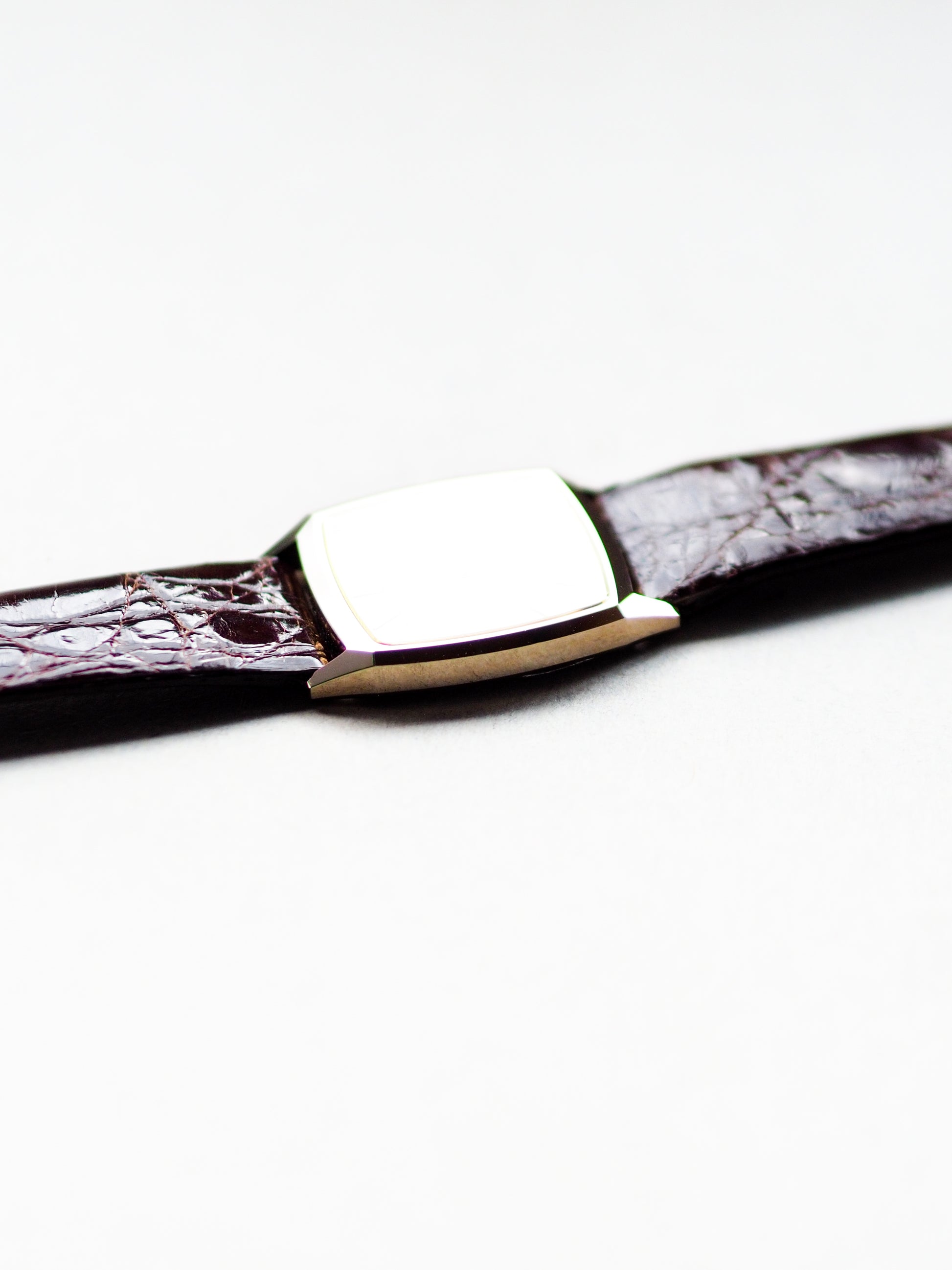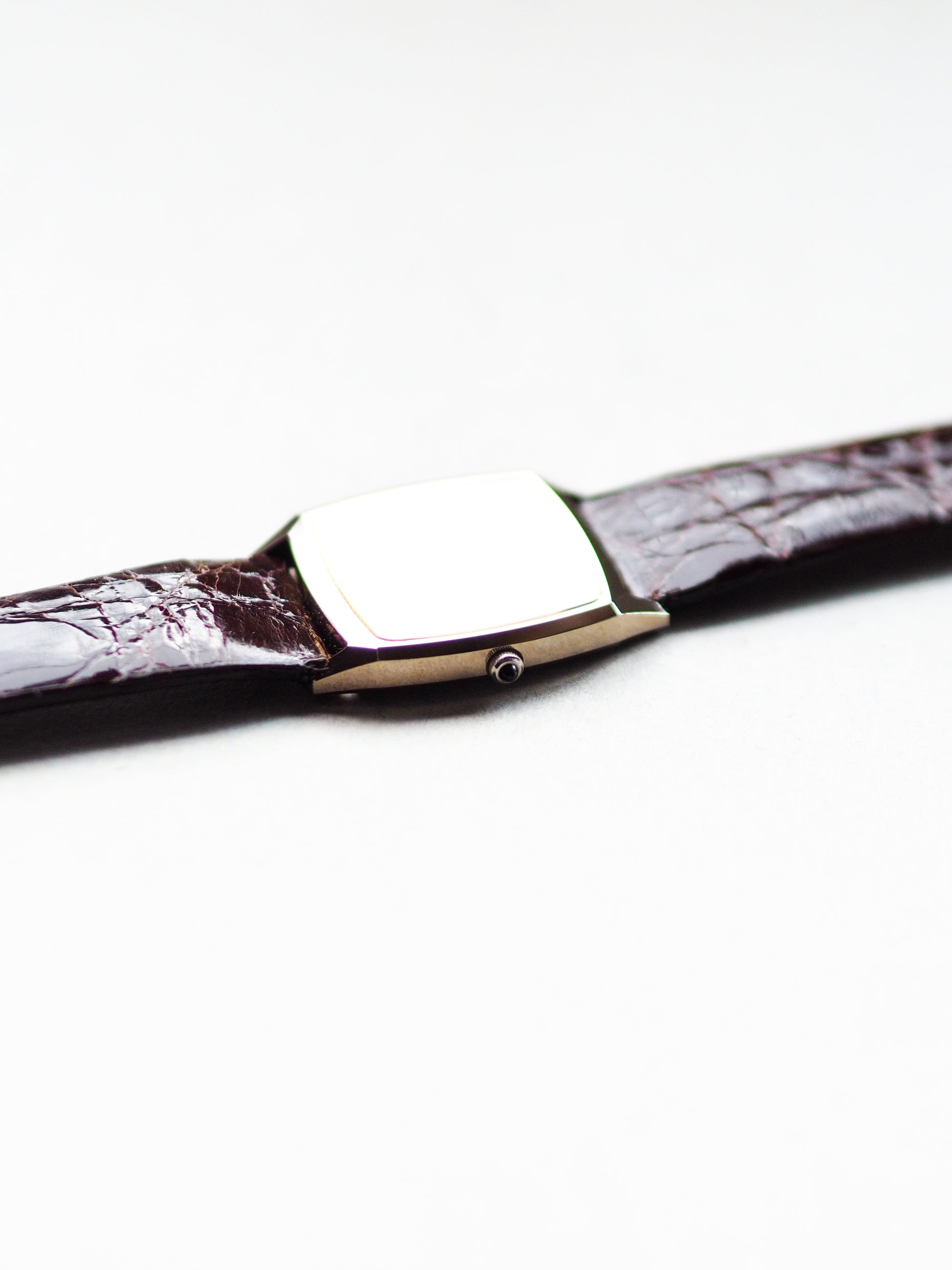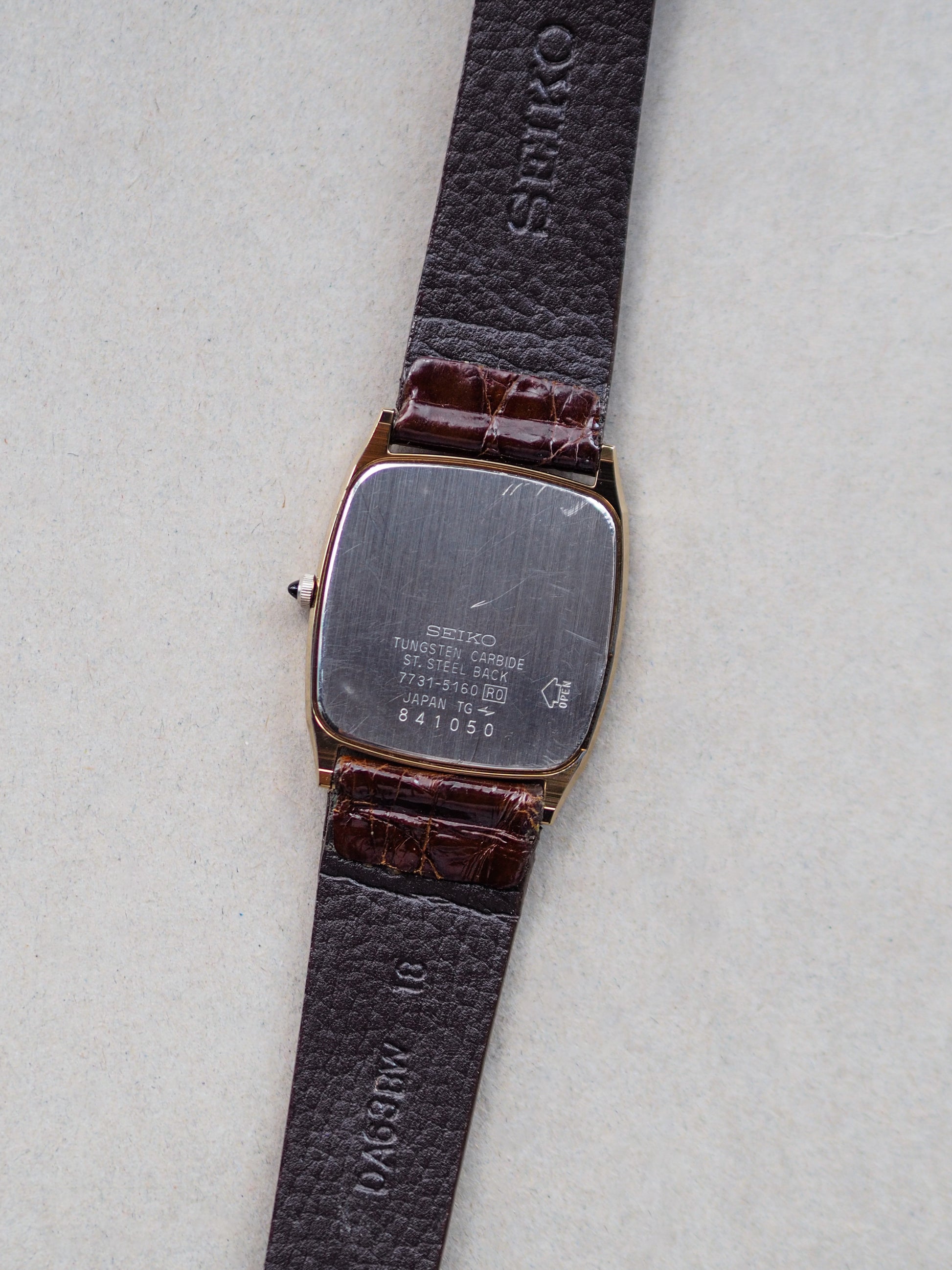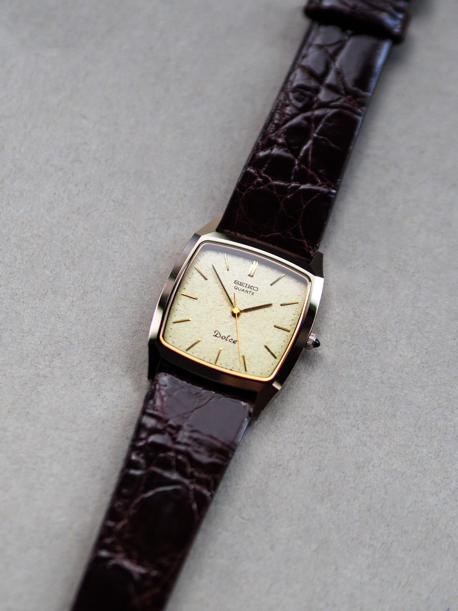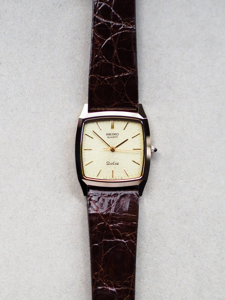This Seiko Dolce 7731-5160 from 1988 is an attractive vintage Seiko tank watch featuring a case with sharp corner edges in a square window shape. This design pairs beautifully with a champagne textured dial and a classic cabochon stone crown.
