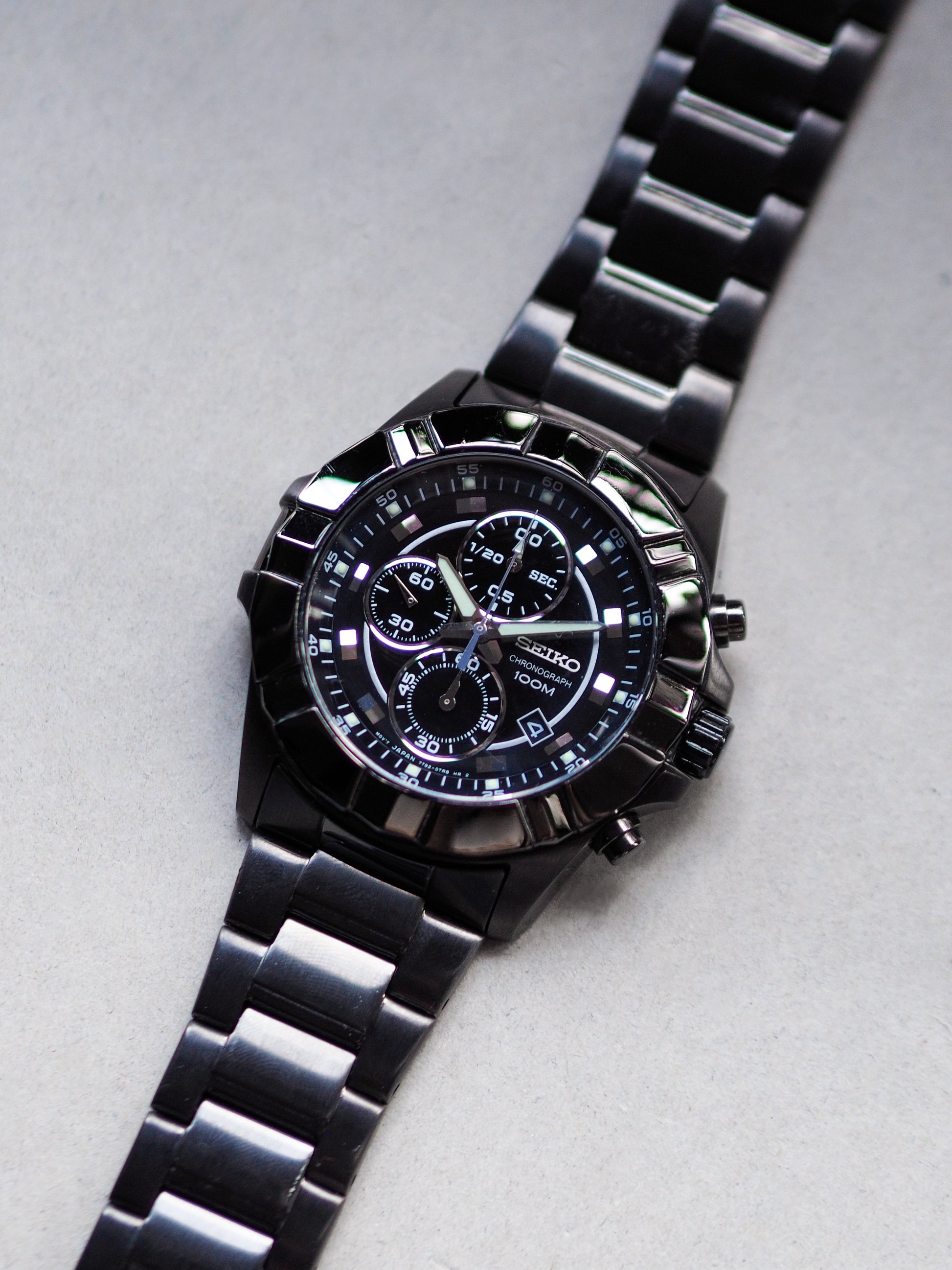 For sale is the Seiko SNDD77P1 Lord Chronograph, a bold all–black stainless steel timepiece featuring a sleek black dial powered by the reliable 7T92 quartz chronograph movement.