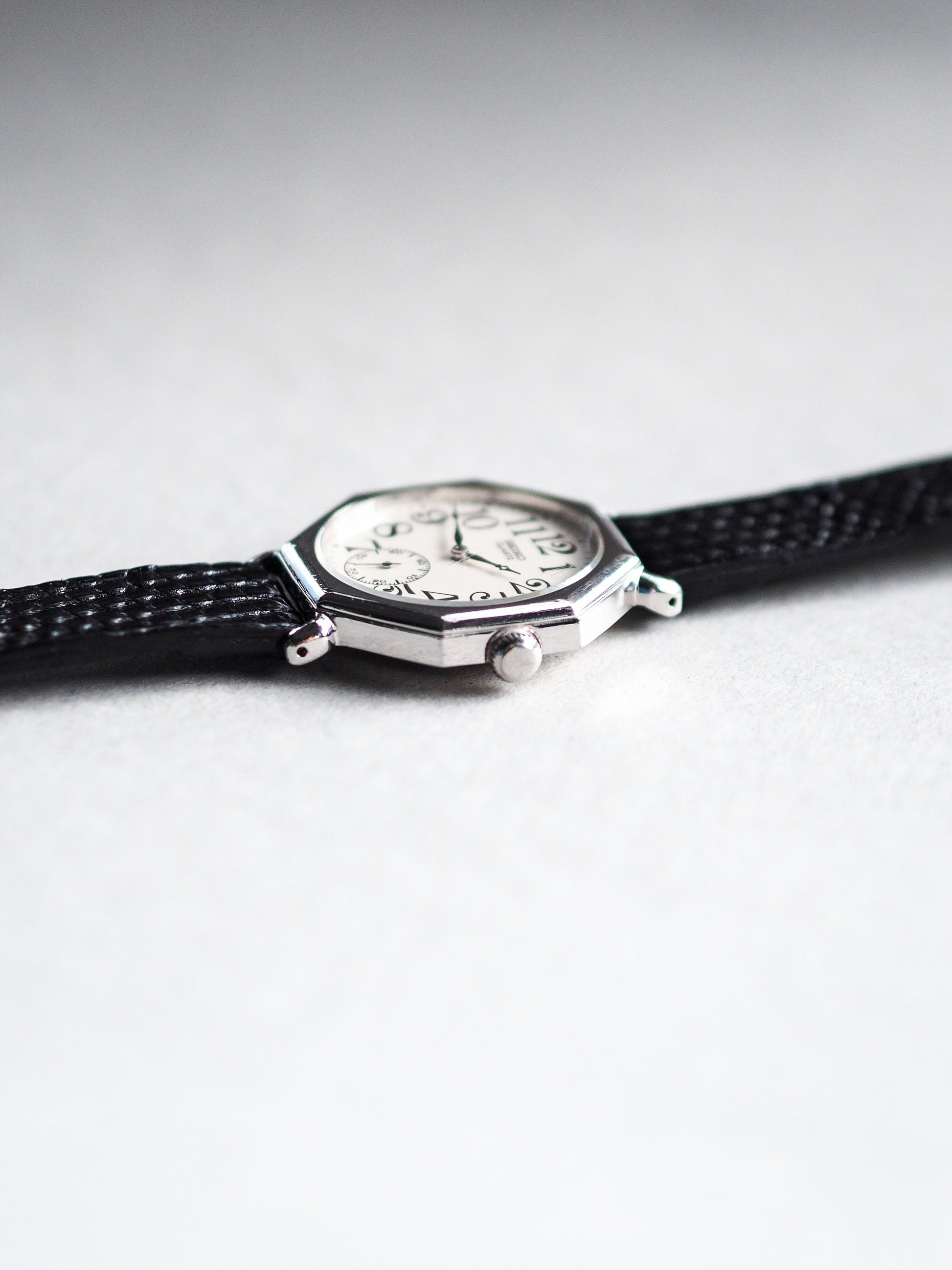 The 1983 Seiko 2628-0150 is a remarkable vintage timepiece that stands out for its distinctive octagonal case and elegant art deco-inspired design. The palladium-plated case not only enhances its durability but also imparts a brilliant, silver-toned finish, accentuating its vintage charm.