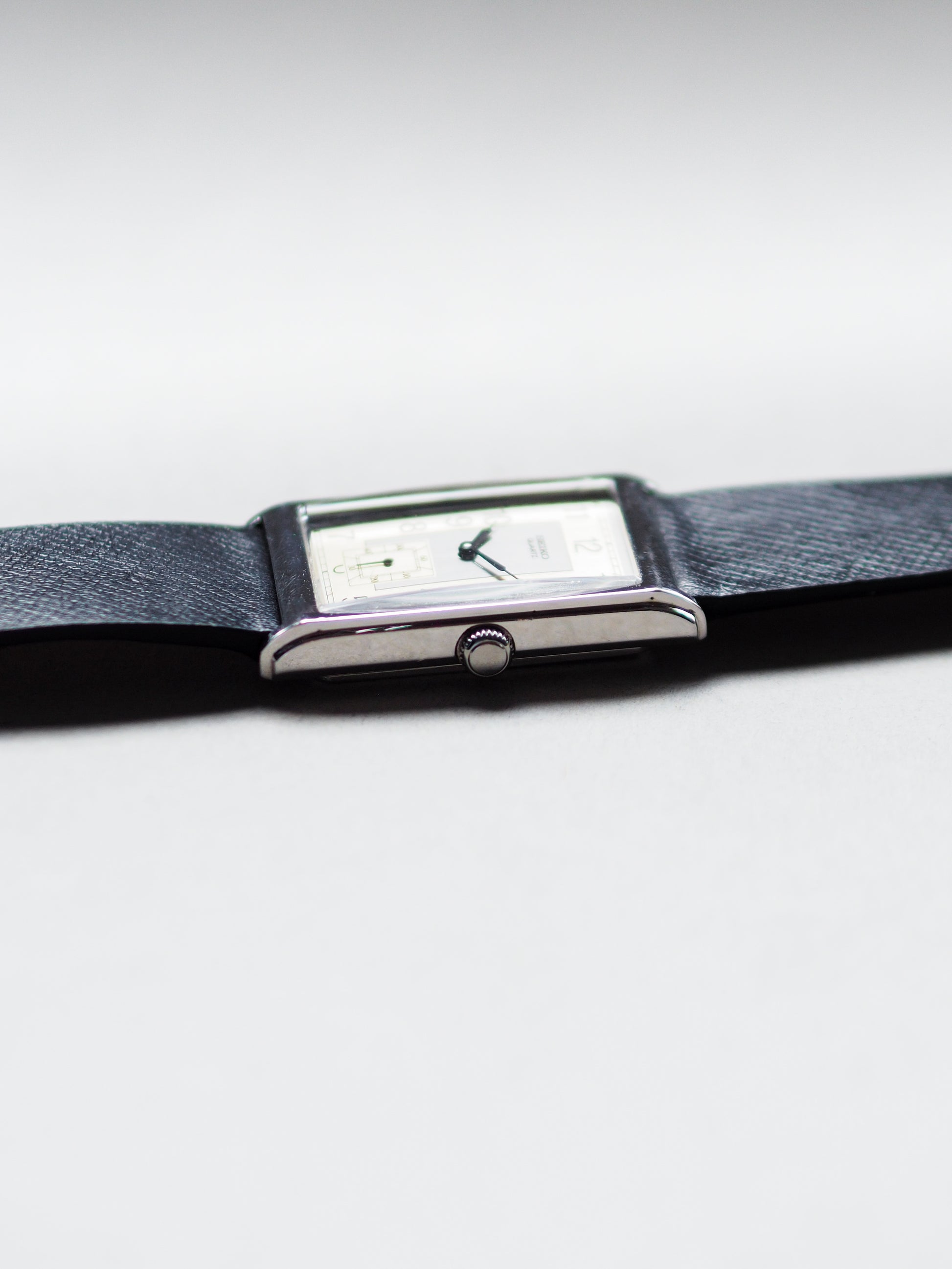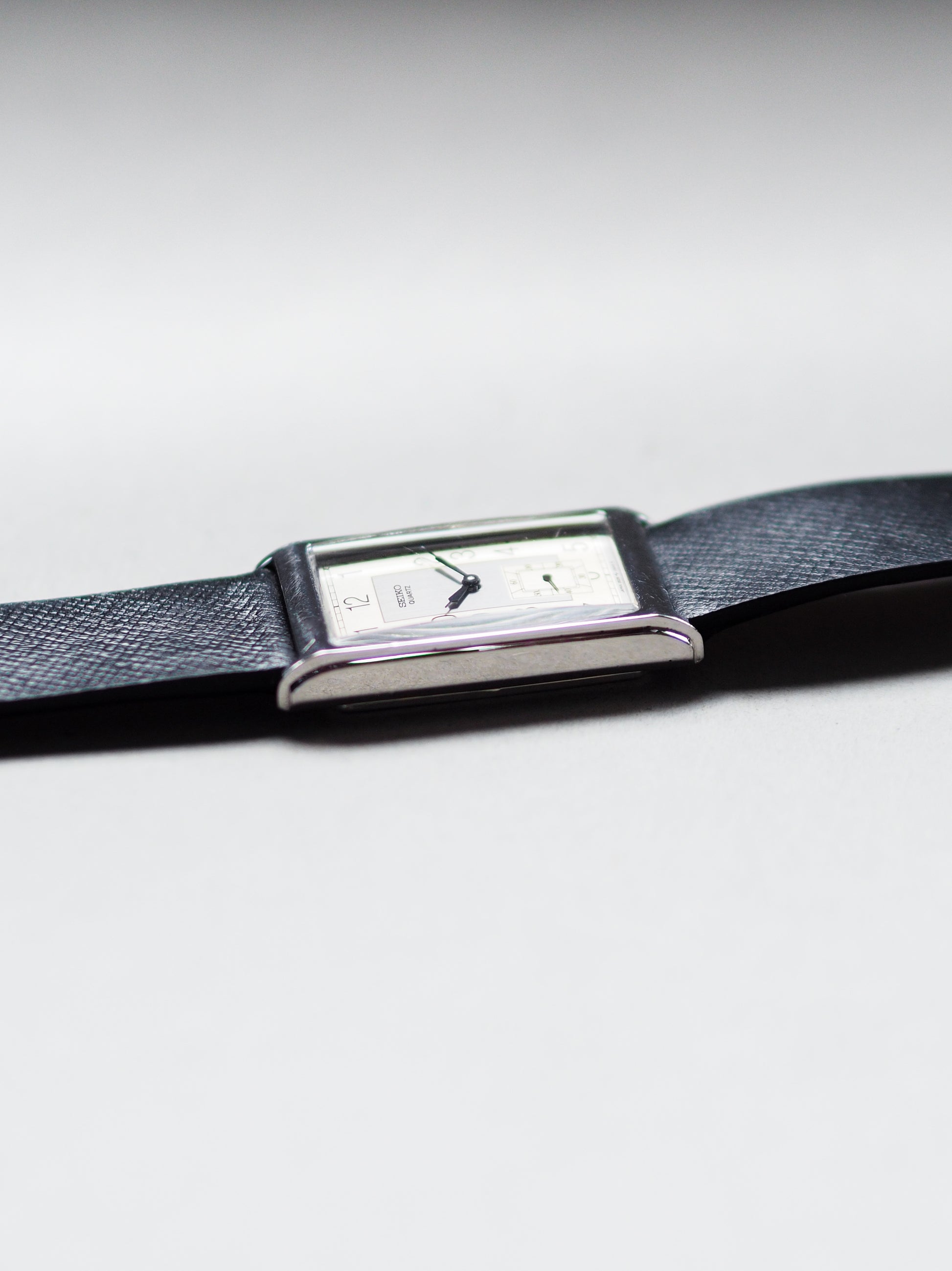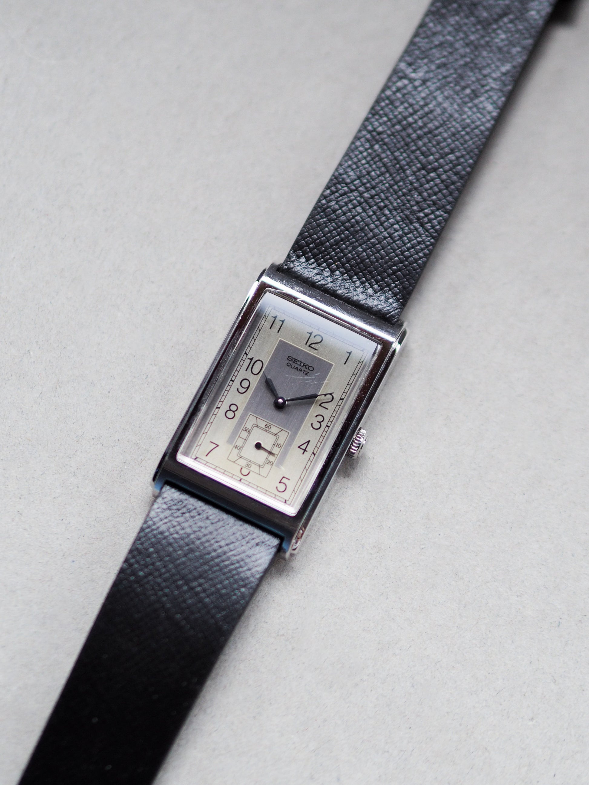 The Seiko 2628-5120, produced in 1982, is a refined vintage tank watch showcasing Seiko’s take on Art Deco-inspired design. Its vertical brushed two-tone silver dial is accented with bold black Arabic numerals, a railway minute track, and distinctive black syringe hands, completed with a sub-seconds register at 6 o’clock—an aesthetic reminiscent of the Jaeger-LeCoultre Reverso Classic Small Seconds.