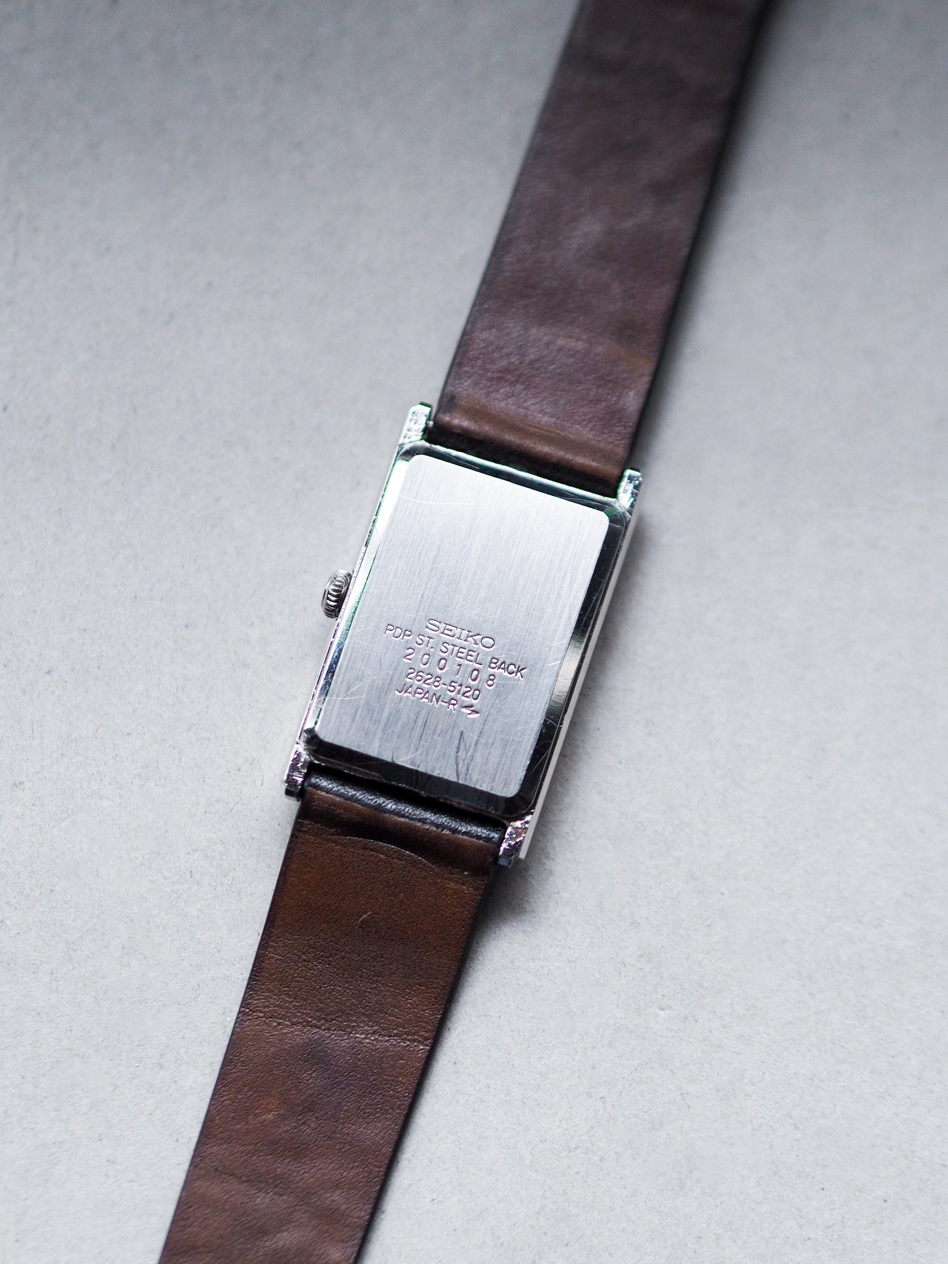 This example remains in good condition, with overall clean dial, light hairline scratches on the crystal, and minor wear on the case. A collectible Seiko tank model, the 2628-5120 stands out as a tasteful homage to Seiko’s early designs of the 1930s and 1940s, while offering the reliability of a quartz movement.