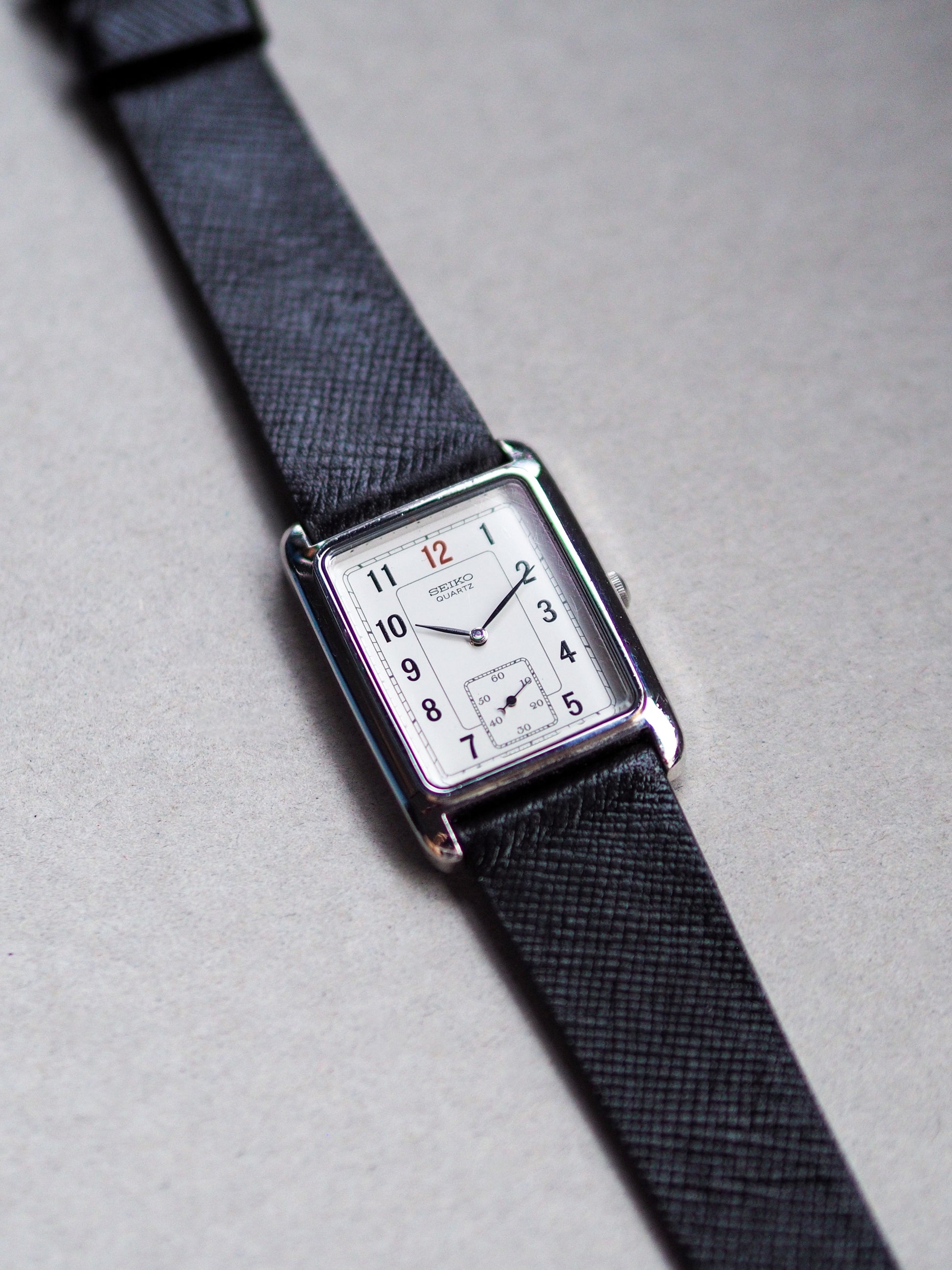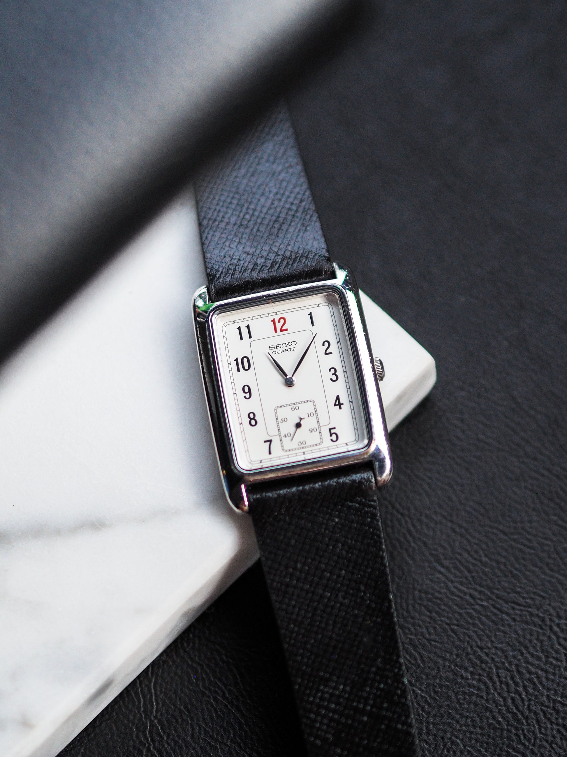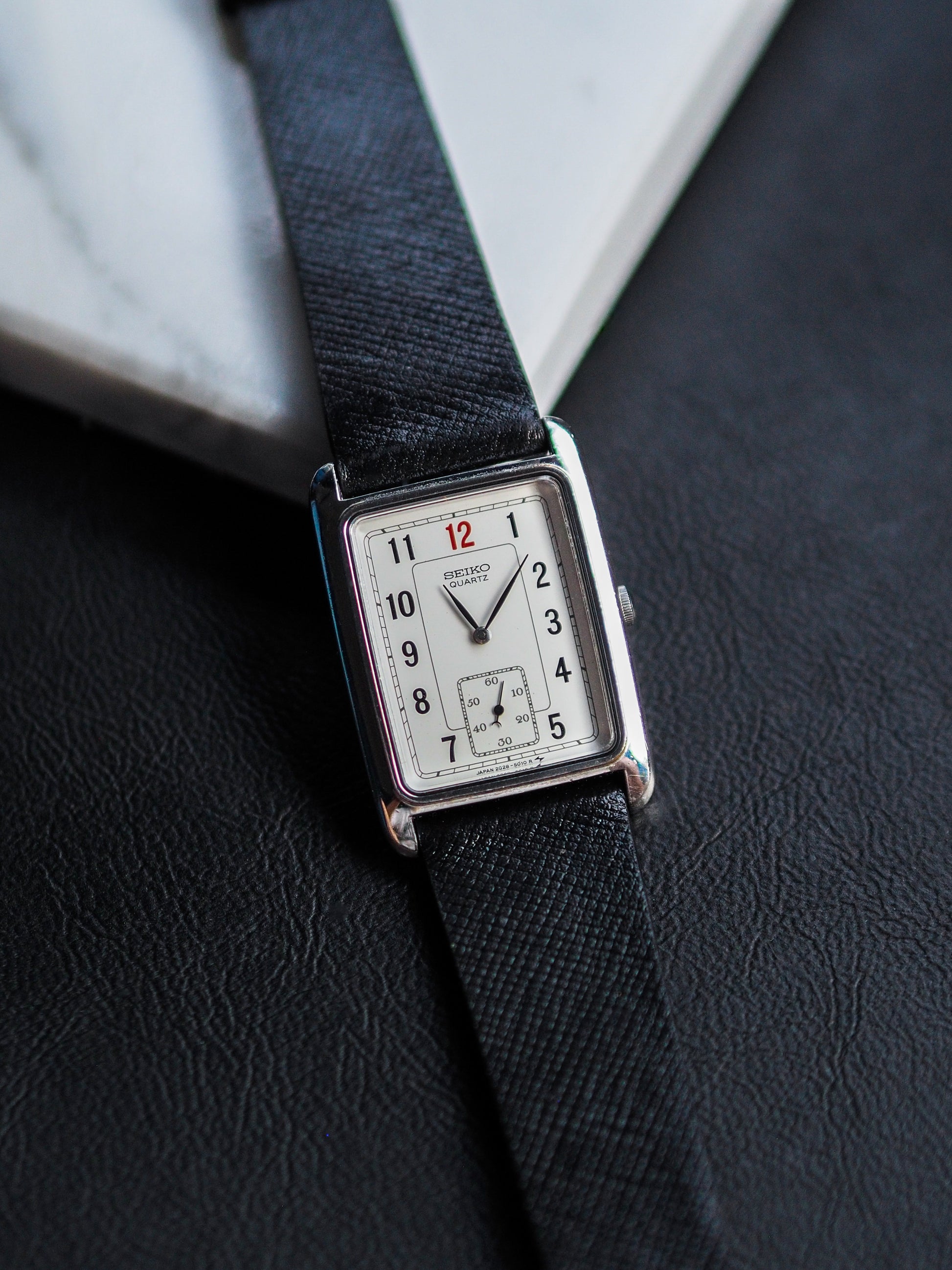 Presenting the Seiko 2G28-5010, a sought-after vintage tank-style timepiece from 1984. This watch features a timeless design with classic numeral indices on a white dial, with a unique detail—the 12-hour marker standing out in red. The sub-seconds dial is positioned above the 6 o’clock marker, enhancing its vintage appeal.