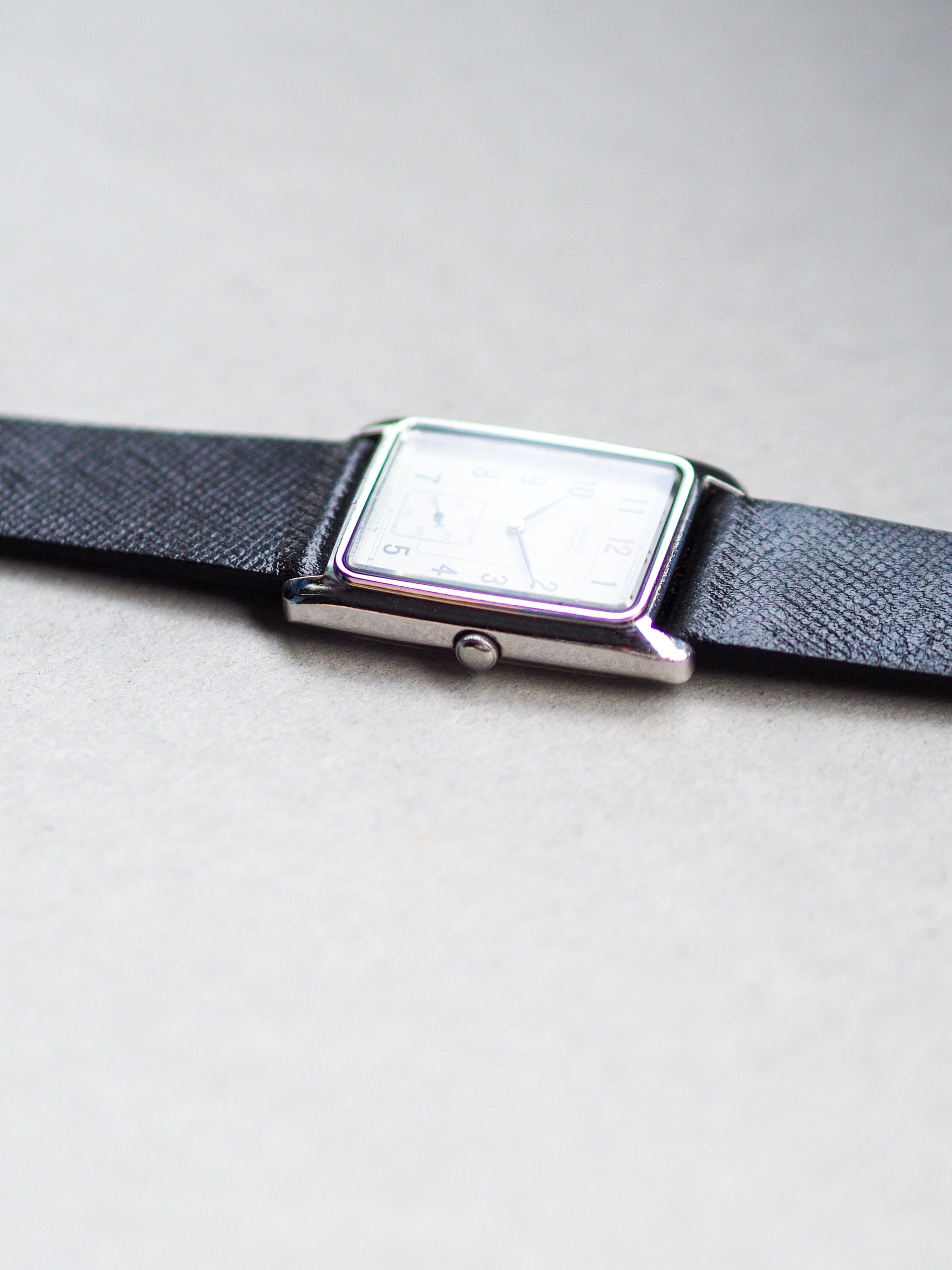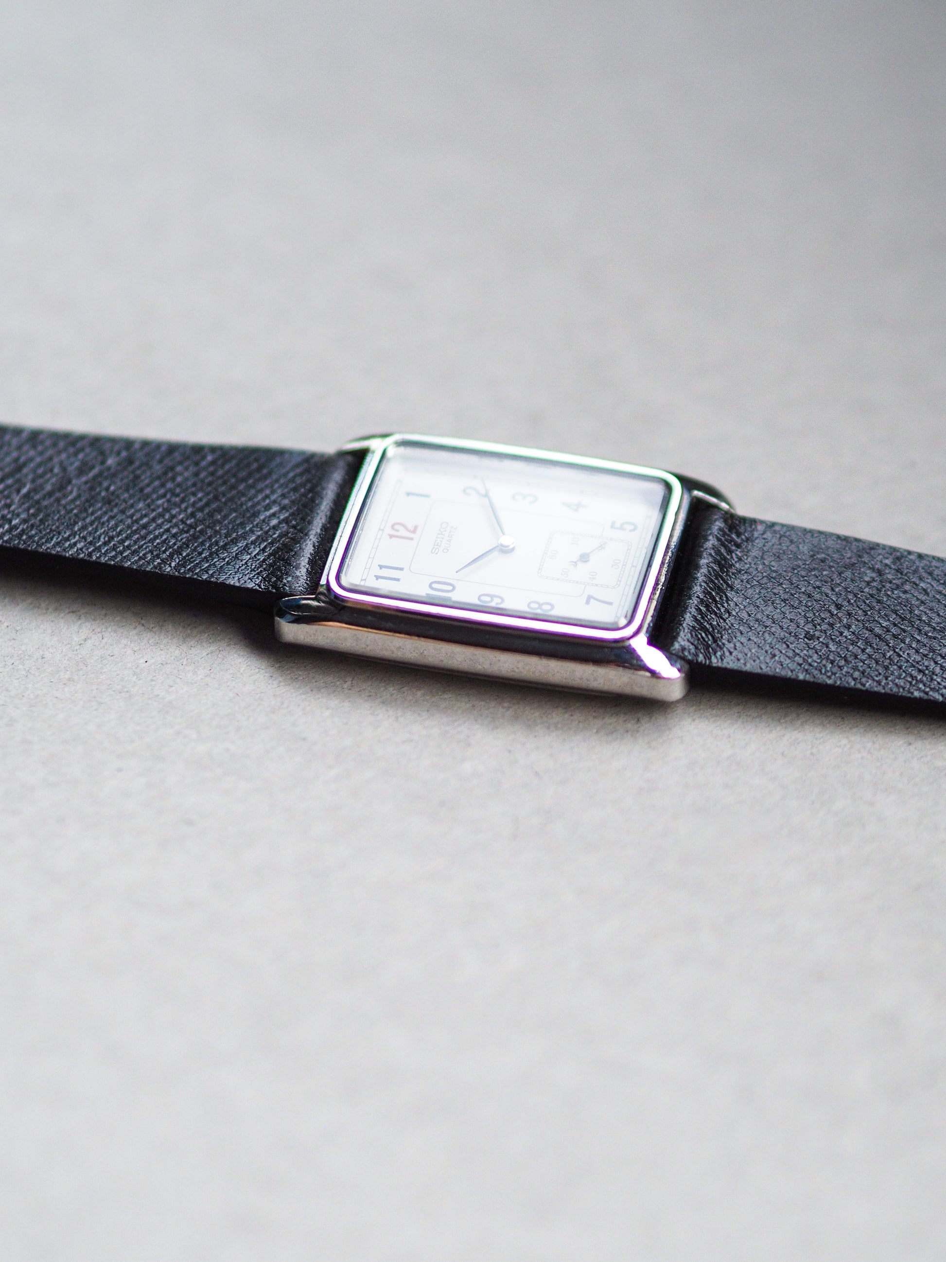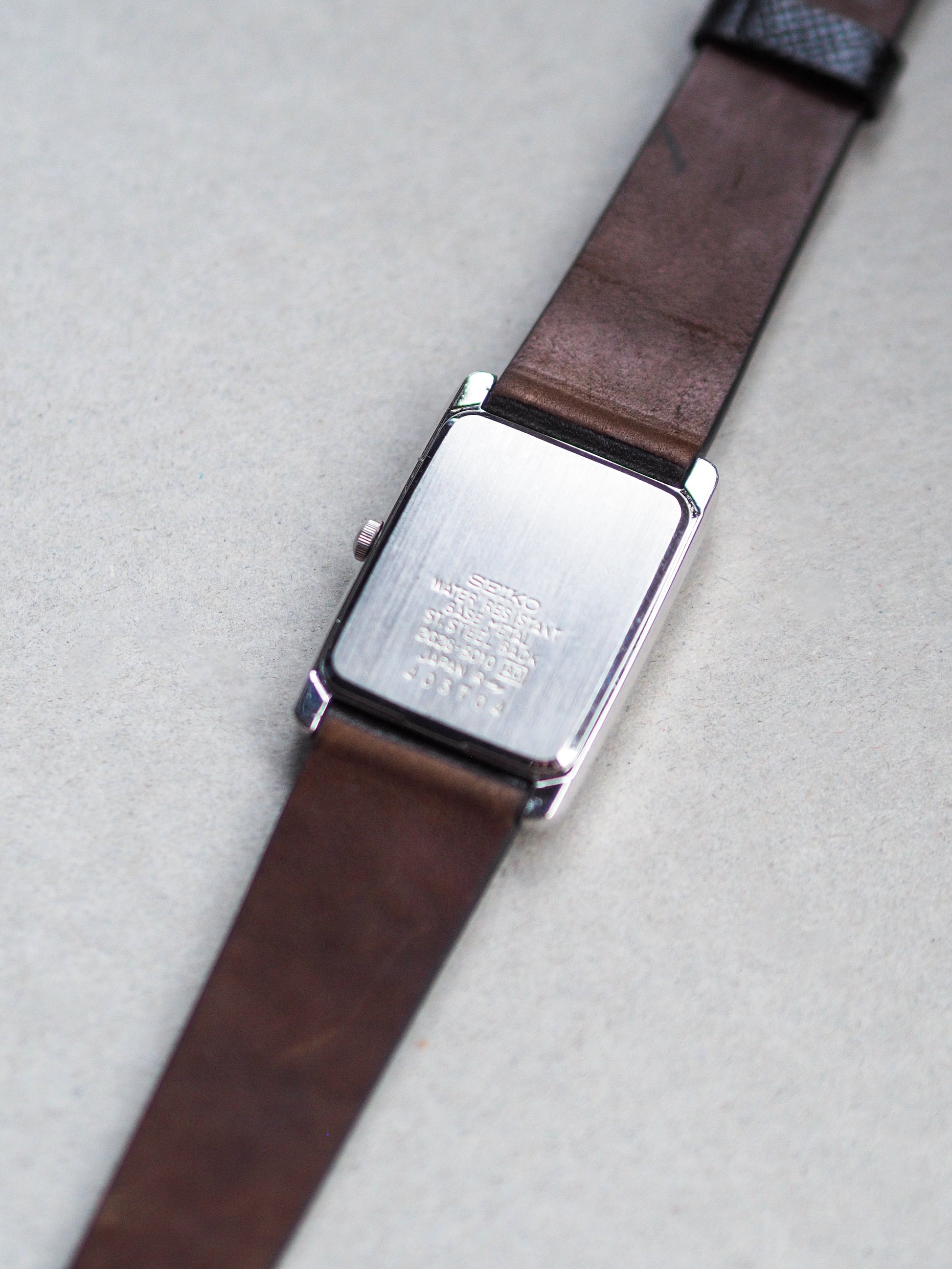 Presenting the Seiko 2G28-5010, a sought-after vintage tank-style timepiece from 1984. This watch features a timeless design with classic numeral indices on a white dial, with a unique detail—the 12-hour marker standing out in red. The sub-seconds dial is positioned above the 6 o’clock marker, enhancing its vintage appeal.