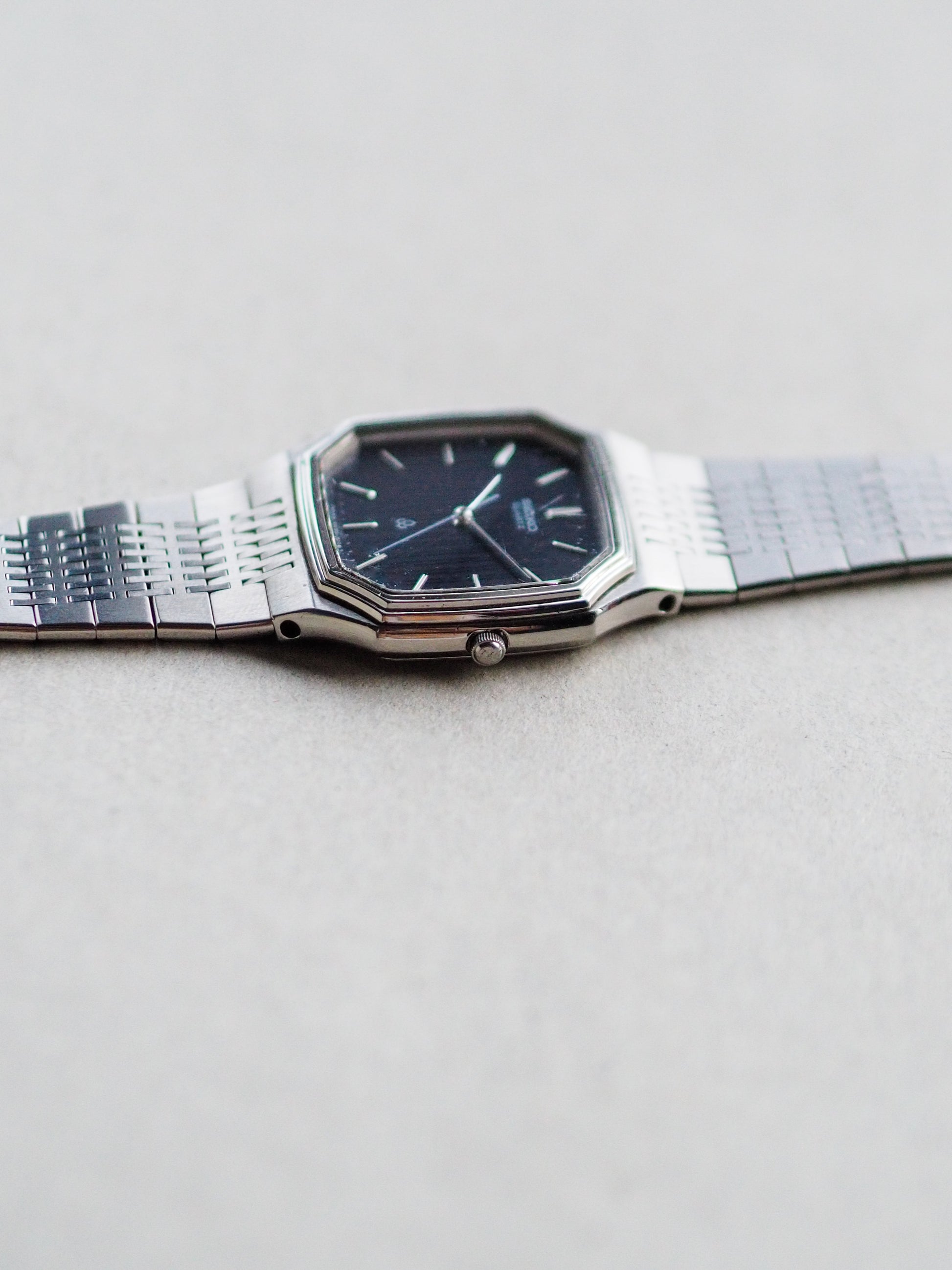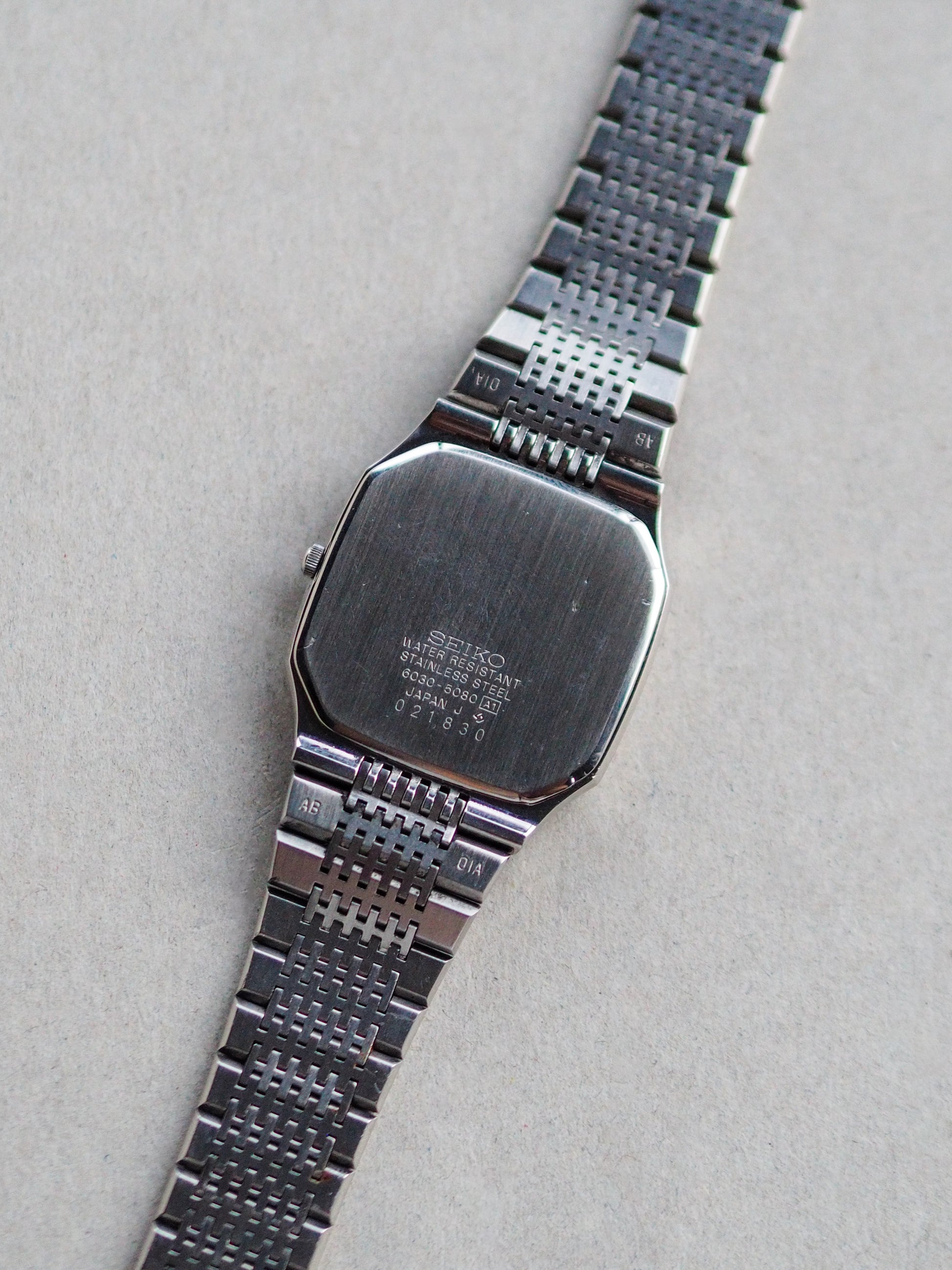 The Seiko 6030-5080, a vintage quartz timepiece from the 1980s, features a distinctive stainless steel octagonal case with gently curved sides, seamlessly integrated with its original bracelet. Its striking grey dial with black pinstripes adds a unique and sophisticated touch to the overall design.